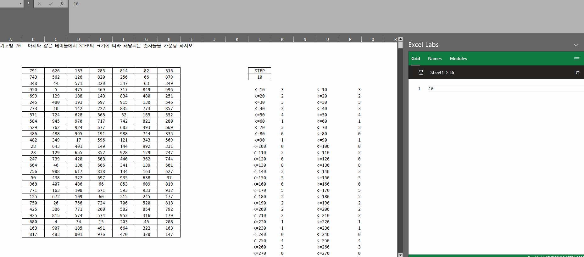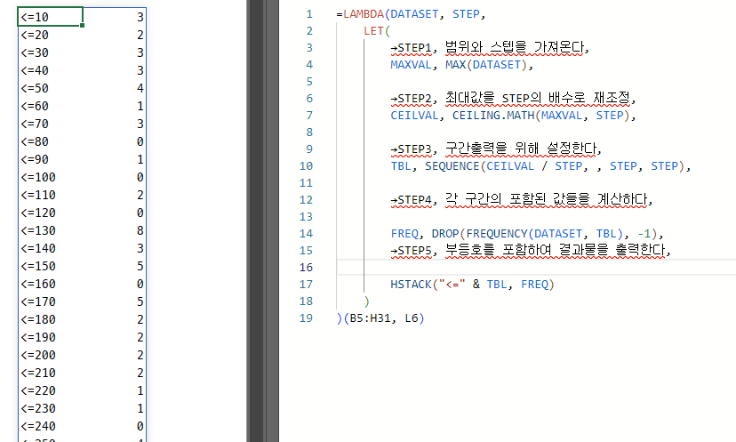 그 다음은 구해진 구간을 셀에 출력한 후 각 구간에 맞는 계산을 하게 되는데 결과물과 같이 ' <= ' 을 포함하기 위해 한번의 작업이 더 들어가야 한다.